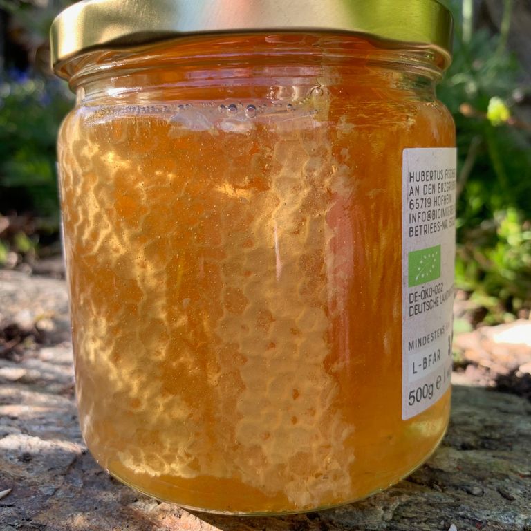 Der Honig verbleibt in den von den Bienen gebauten Wachszellen – versiegelt mit einer feinen Naturwachsschicht, die die Qualität bewahrt und das besondere Aroma schützt. Aufgefüllt wird das Glas mit flüssigem Honig derselben Ernte.