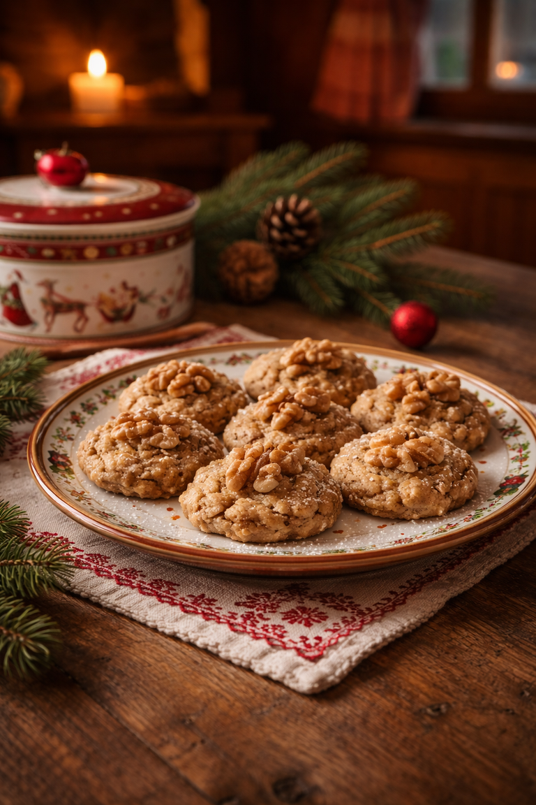 Diese Plätzchen leben von der Harmonie weniger, gut aufeinander abgestimmter Zutaten. Honig verleiht ihnen eine milde, runde Süße mit feinen Karamellnoten, Walnüsse bringen Tiefe und ein angenehm herbes Aroma. Haferflockensorgen für eine saftige, leicht kernige Textur, während Zimt, Nelke und Vanille Wärme und Würze beisteuern. Ein Hauch Zitronenschale hebt die Aromen und sorgt für Frische im Nachhall.
